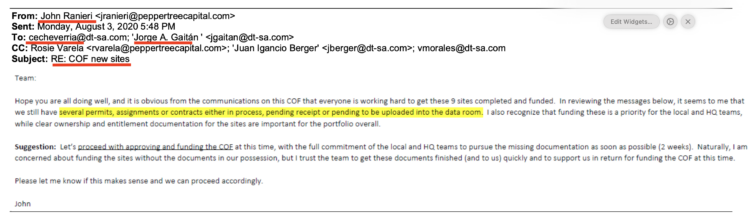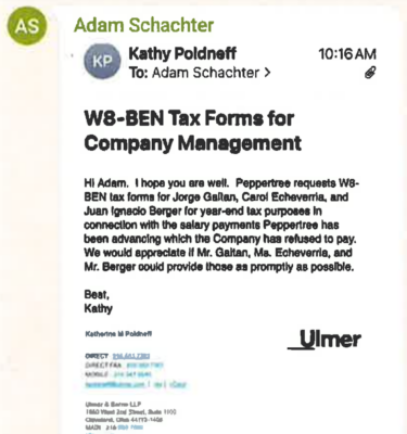 “[Gaitan] Adam, it is important you tell Ungar [Peppertree’s counsel] that we strongly demand from them to ask for our restoration into the company operation… Mr Gaitan and Ms Echaverria are more than happy they reach out to our personal lawyer from Carrillo law.. ”