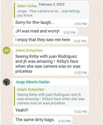 Included in the chat group was Gaitan’s then personal lawyer (being funded by Peppertree), one Juan Carlos Zamora, who also chipped in calling the couple “profiles in courage”. Mr Gaitan responded with a telling reference, thanking “the people behind” these supportive allies and saying it was “an honour to be on your side”: