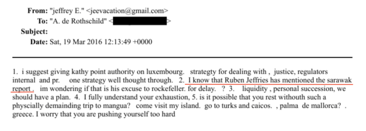In this March email Epstein gives away some very interesting names from the circle of concerned parties in this matter. “I know Ruben Jeffries has mentioned the Sarawak Report” he tells Ariane de Rothschild, and he suggests that she give ‘Kathy’ “point authority on Luxembourg strategy, for dealing with justice, regulators internal and PR; one strategy well thought through”: