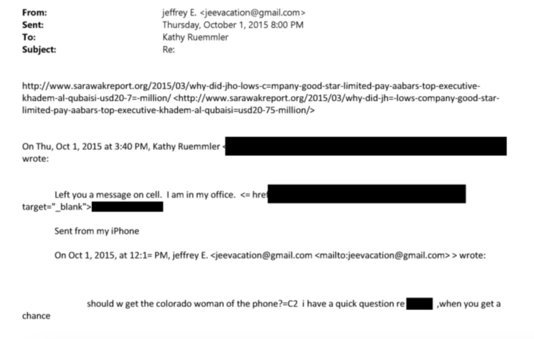 By the following day Epstein was on to one of his key contacts, a lawyer called Kathrine Ruemmler. His email asked “should we get the Colorado woman on the phone? I have a quick question re [redacted] when you get a chance”. He then attached a link to Sarawak Report’s original article entitled “Why did Jho Low’s company Good Star Limited pay Aabar’s to executive Khadem al Qubaisi $20 million?”. Ruemmler had replied she had left a message on his cell phone but was in her office…. indicating perhaps that it would be better to communicate after she had left.