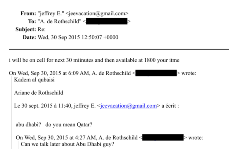Three days after that in depth expose, Ariane had apparently first reached out to Epstein for help, asking “Can we talk about the Abu Dhabi guy?”. At first Epstein was confused as to who the “Abu Dhabi guy” was. He queried if she meant some other person they had apparently discussed, who was from Qatar. No, it was Khadem al Qubaisi, she explained. Epstein had replied that he could talk “now if you like”, adding “I will be on cell for next 30 minutes then available from 1800 your time”: